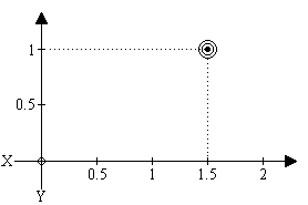 IFS Code is the underlying set of numbers that makes the fractal. Each transformation is defined by six numbers that tell the program the position, shape, and size of the transformation. These numbers represent three points using the Cartesian coordinate system. These three points are the "right" corner, the "left" corner, and the "base" of the transformation. Two numbers are used to define each point. The first number is the X or horizontal coordinate. This is the horizontal distance from the origin. The second number is the Y or vertical coordinate. This is the vertical distance from the origin. Notice the diagram to the right. The target is at x 1.5", y 1.0". If the target were to the left of the origin, the X coordinate would be a negative number. Likewise, if it were below the origin, the Y coordinate would be a negative number. In this way, you can define a point anywhere on the plane. |